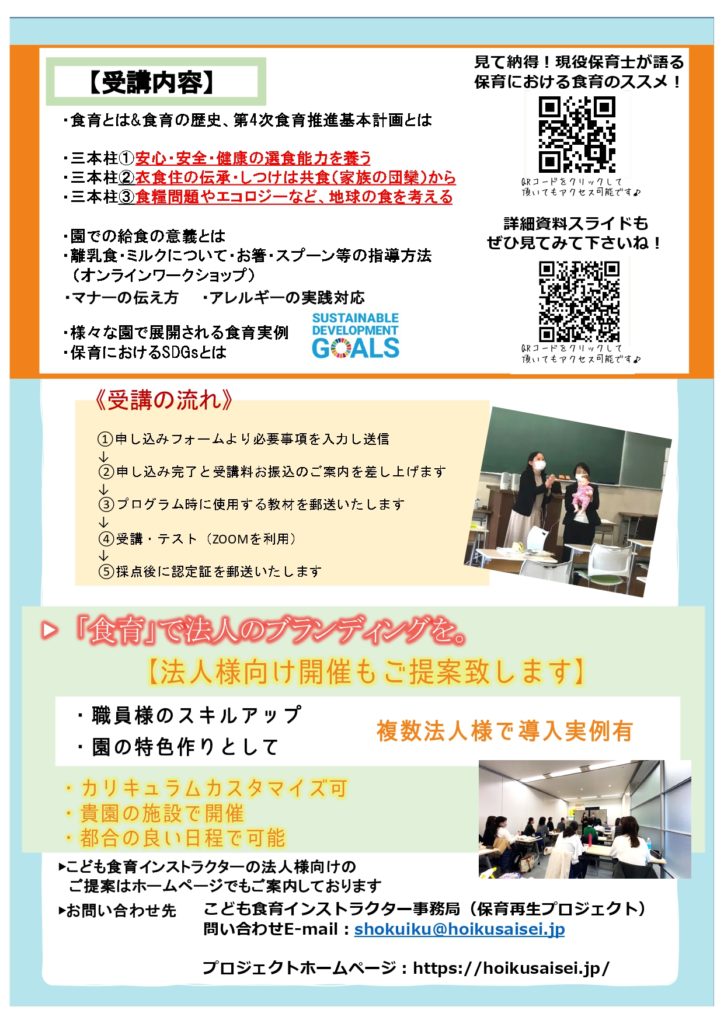 ※講義内容の例;食育とは&歴史、食育の三本柱、園給食の意義、離乳食・ミルクについて、食具の伝え方、マナーの伝え方、アレルギーの実践対応、園での食育実例 等